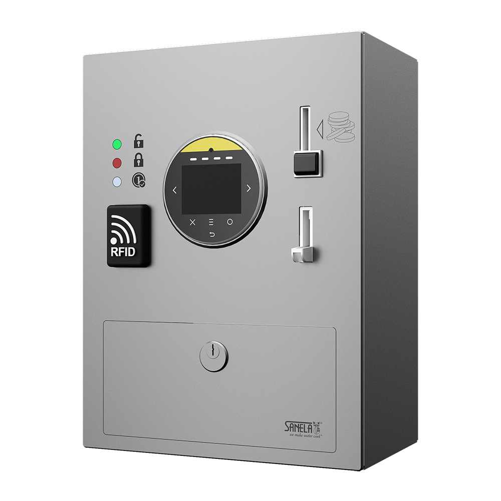 - parameter setting and communication with the electronics via the Sanela Control app (Bluetooth) (adjustment of shower time according to the thrown coin or token, time delay of switch on, possibility of activation of hygienic flush, current euro exchange, token value)